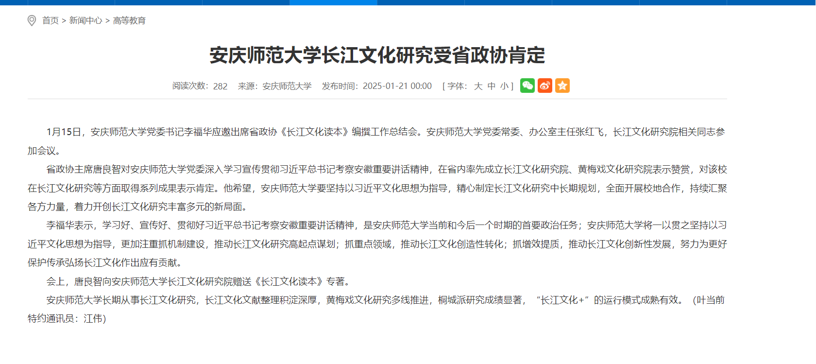 來源:【安徽教育網】安慶師范大學長江文化研究受省政協肯定_安徽省教育廳 (ah.gov.cn)